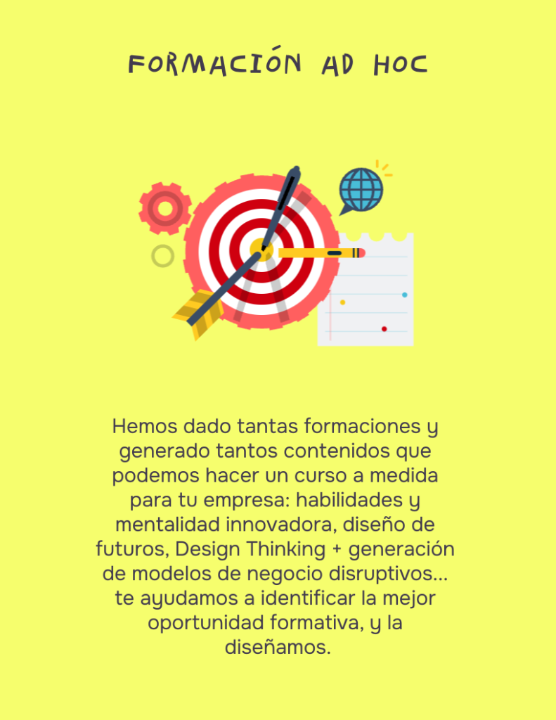 Para dar solución a estas inquietudes que puedan surgirte, ponemos a tu disposición material y recursos que te permitirán conocernos mejor, entender bien en qué consiste el Design Thinking, o cómo se desarrolla una mentalidad innovadora, entre otros. Puedes encontrarlos en nuestro apartado de Recursos de la web.